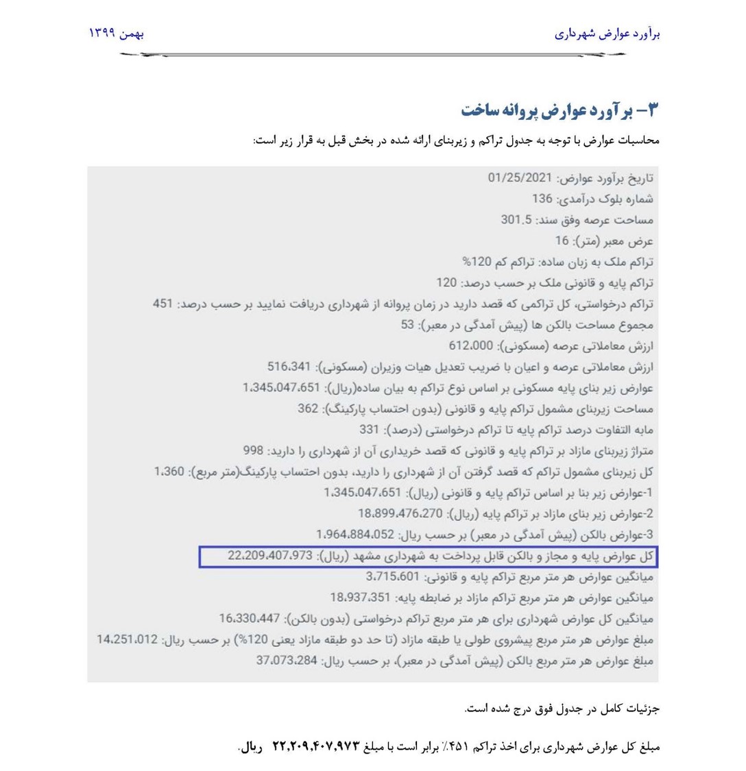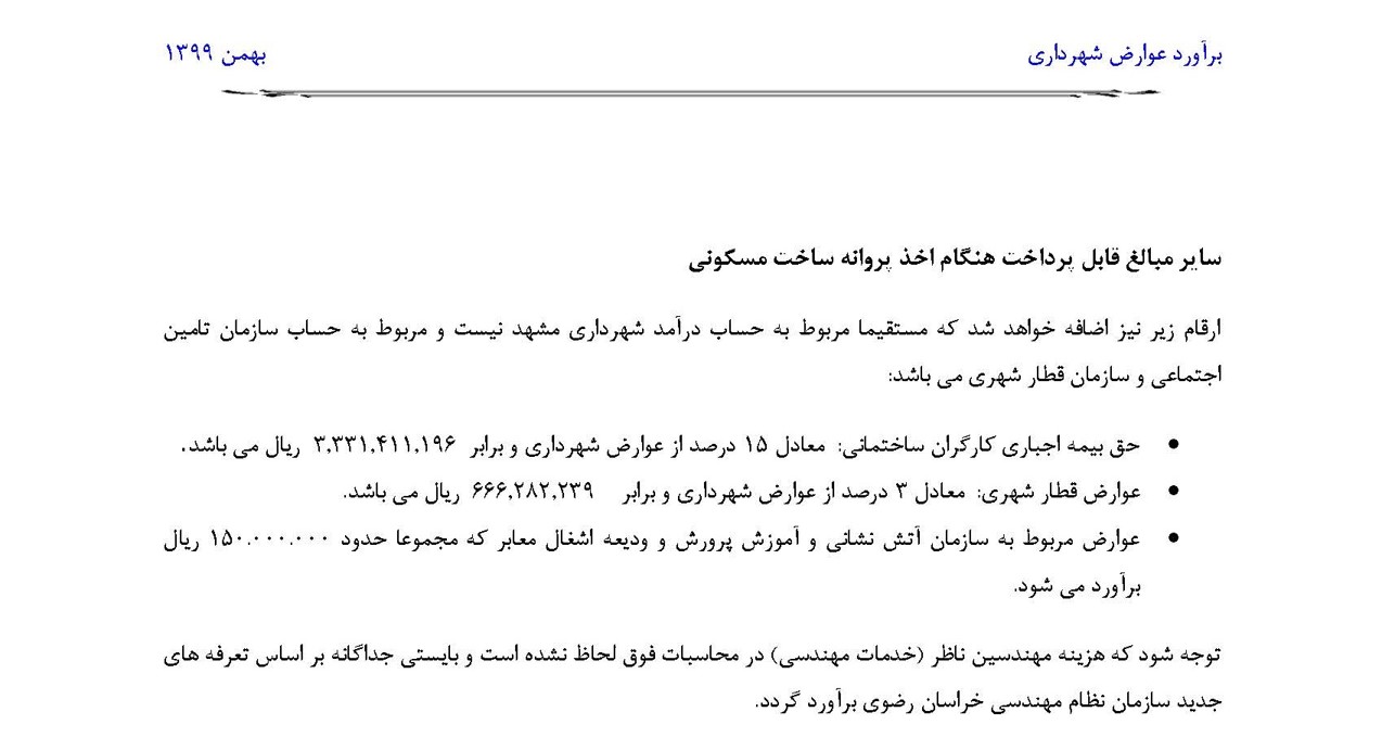 با توجه به تجربه کار و فعالیت مستقیم در شهرداری مشهد و تخصص های تحصیلی، آمادگی خویش برای انجام محاسبه و برآورد عوارض ساختمانی ملک شما در مشهد را اعلام می کنیم.