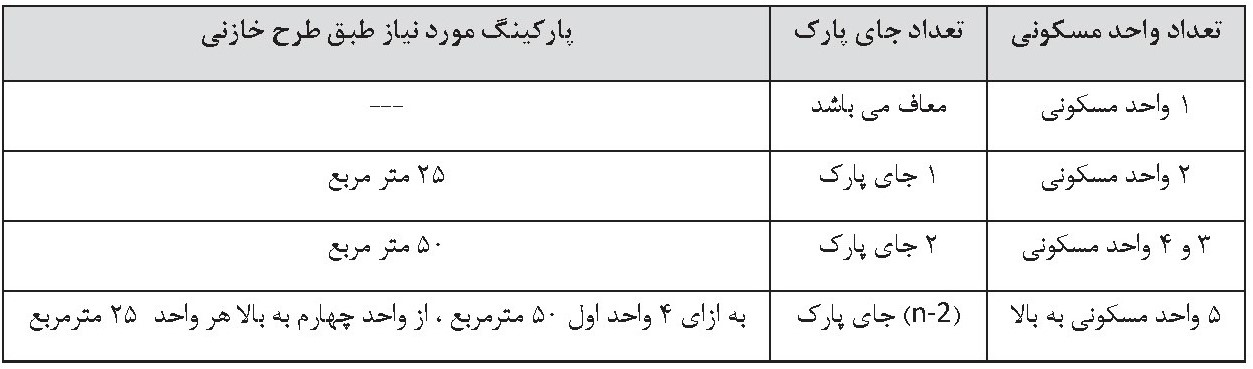 - مساحت 40 مترمربع فضای حیاط قابل پارک بهعنوان یک واحد پارکینگ محاسبه میگردد.