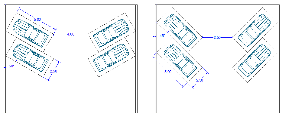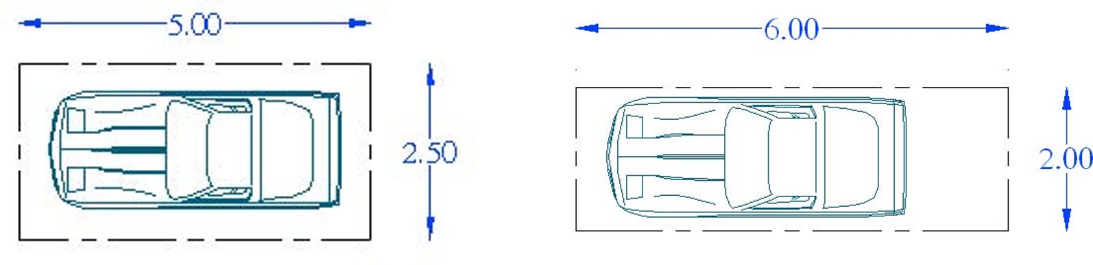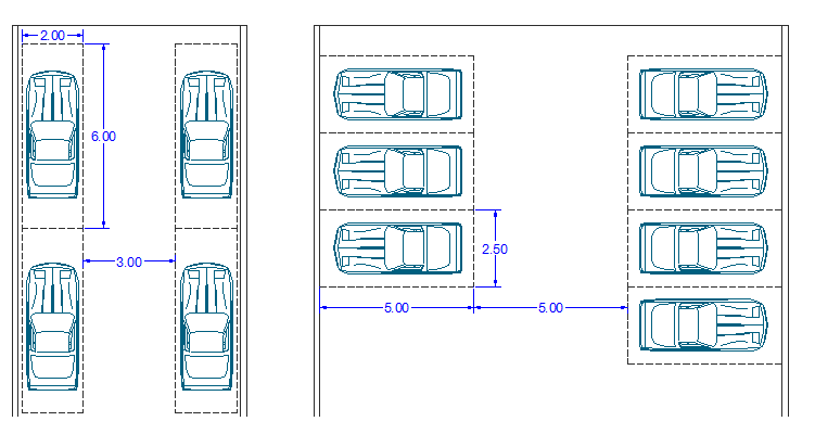 ابعاد لازم جهت توقف دو خودرو درصورتیکه کنار یکدیگر قرار گیرند) با زاویه پارک – 90 درجه5×2,5 متر و زمانی که خودروها در طول و پشت سرهم قرار گیرند، ابعاد موردنیاز 6×2 متر میباشد.
