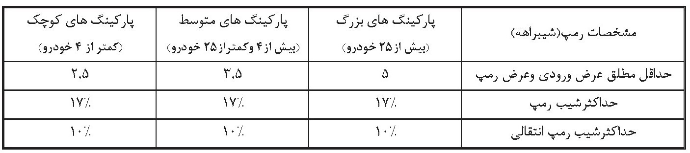 - حداقل عرض رمپ جهت دسترسی پارکینگ مسکونی 2,5 متر و در تجارتیها 3,5 متر میباشد.