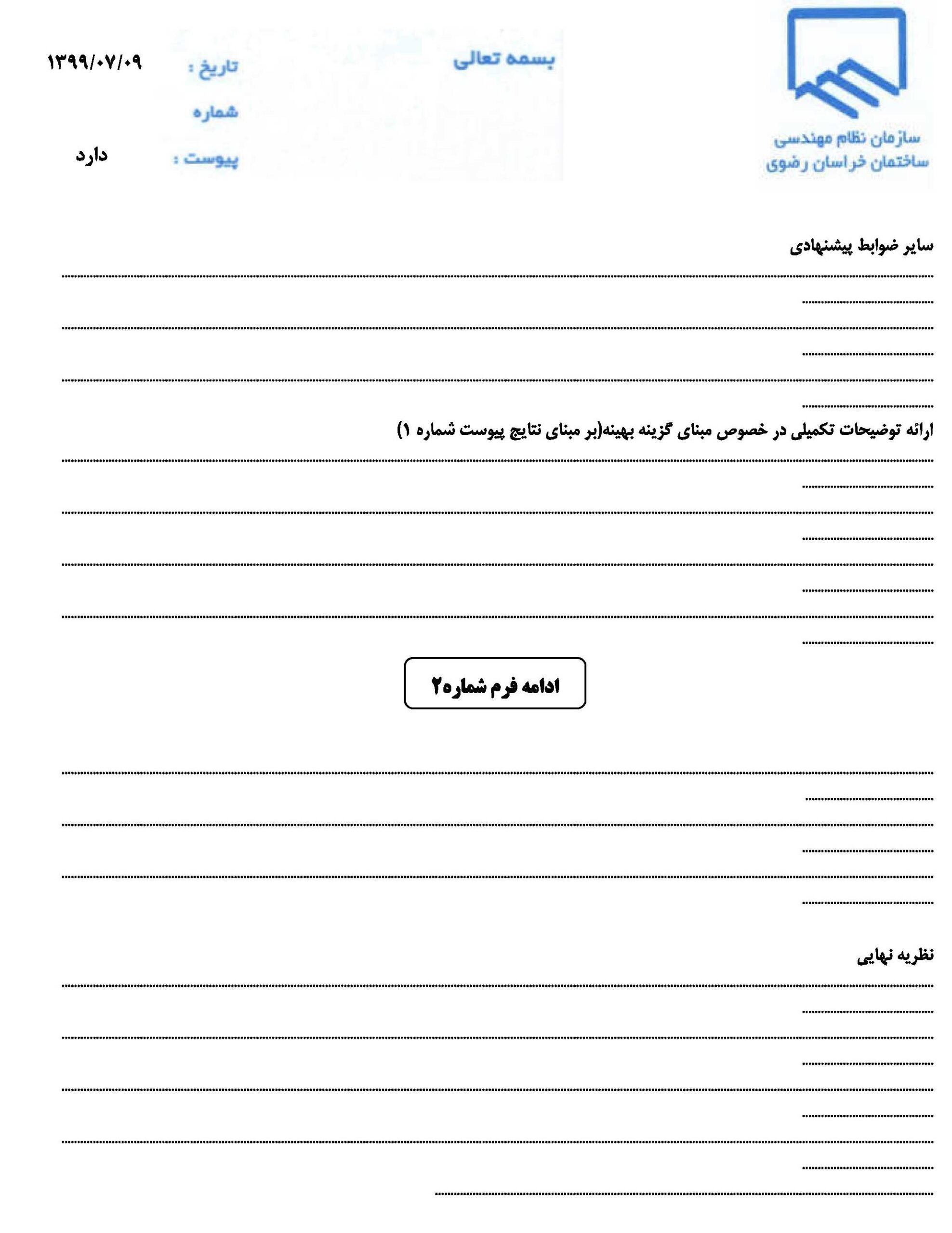 لازم به ذکر است با توجه به دستورالعمل جدید سازمان نظام مهندسی  مورخ 1399/9/1  ،گزارشات نظام مهندسی در دو بخش جداول و پیوست های گزارش تدوین خواهد شد . این محصول براساس این دستورالعمل در فروردین سال 1400 به تایید سازمان نظام مهندسی ساختمان خراسان رضوی رسیده است.